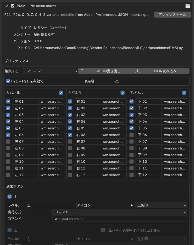 パイメニューエディターは直観的にコマンドを設定できたり、アイコンを設定できたりした一方で、やはり、その操作感のためにはblenderにはもともとなかったものをたくさん詰め込んで動かす必要があったらしい