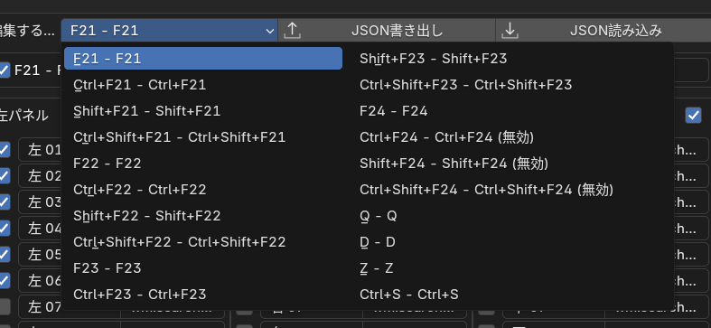 僕はロジクールのG915のような、左側に5個のファンクションキーがあるキーボードを愛用しており、それらにファンクションキーの21~24と、マウスの左クリックを割り当てて使っている
