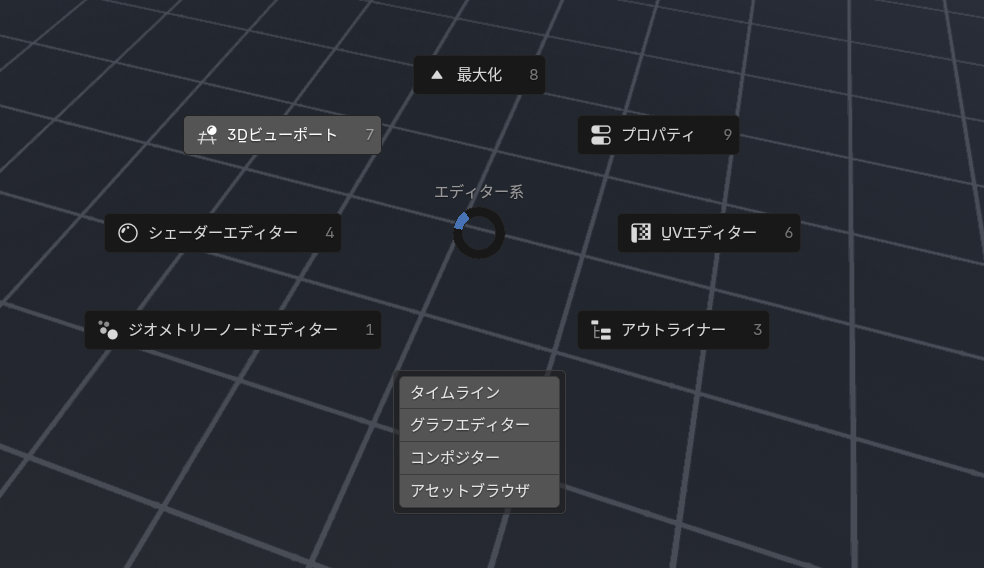 ctrl+Aとかを押すと、上のようにカーソルの周りにパイメニューが立ち上がる